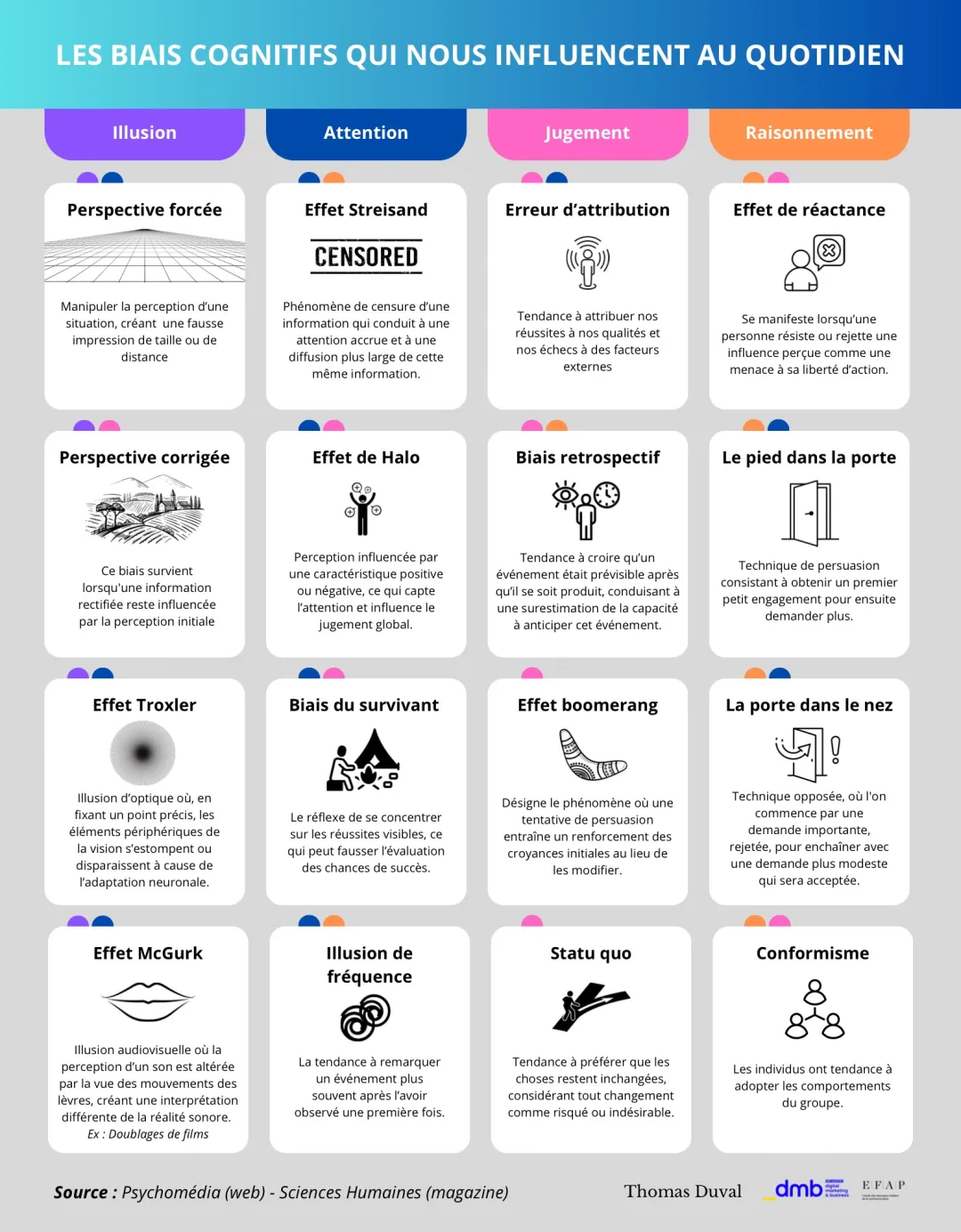 - Confirmation : “Je crois, donc je sélectionne ce qui me conforte.”